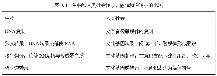 生物的遗传物质要先转录成信使RNA,再经过翻译表达为蛋白质的结构,蛋白质形成组织、器官和生物体。作为符号的观念和理论也要经过转录表达为人头脑中的意识,再翻译,即在意识支配下改造世界。把媒体符号表达为意识的过程与把DNA转录成信使RNA的过程相对应。